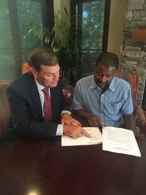 Ken Swindle, Chief Investigator for Prince Glover Hayes, is shown with Mr. Percy Jones as they read over documents in connection with Mr. Jones’ lawsuit. Bob Prince, senior partner at PGH, ...